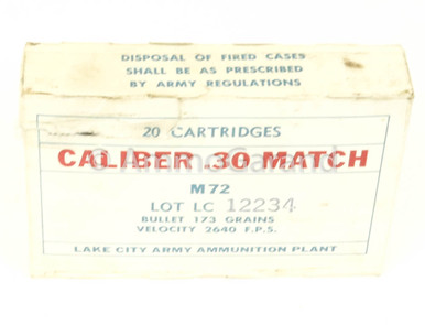This auction is for one unopened box of Lake City M72 Caliber 30 Match ammo.